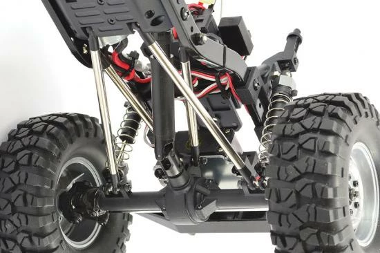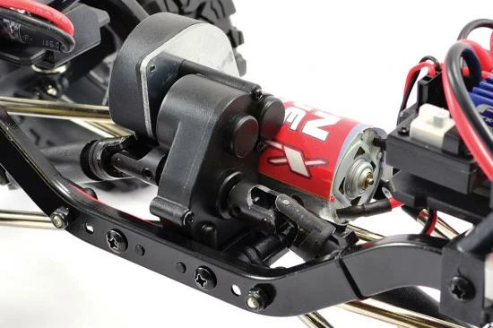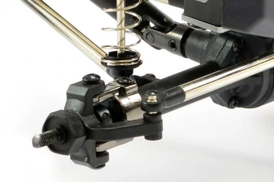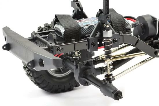 New updated front and rear axle housings have been widened increasing the track width by 15mm for an improved handling and reduced wheel scrub. A higher torque and larger 390 size brushed motor now handles the power, while new 4-point nickel-plated suspension and steering links provide more precise articulation and steering. The oil filled shock absorbers have now been moved outboard for more scale realism and handling improvements. A new servo mount from aluminium provides scope for different servo options.