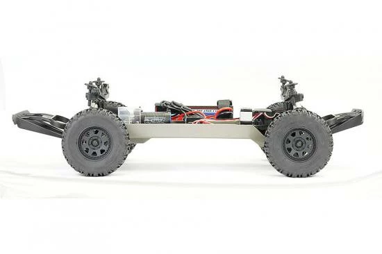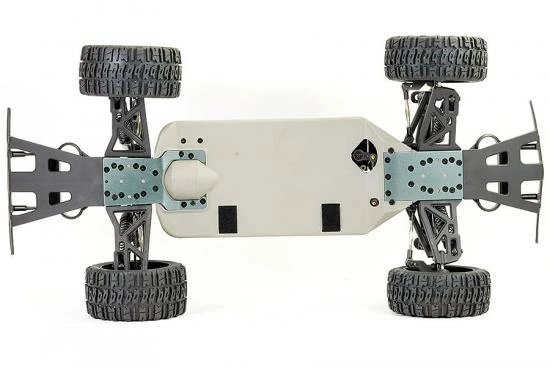 Front and rear shock absorbing bumpers and skid plates, hidden inside the bodyshell provide out of sight protection. Aggressive treaded pattern tyres, wider on the rear for extra traction are mounted to 8-spoke wheels and include a functional spare.